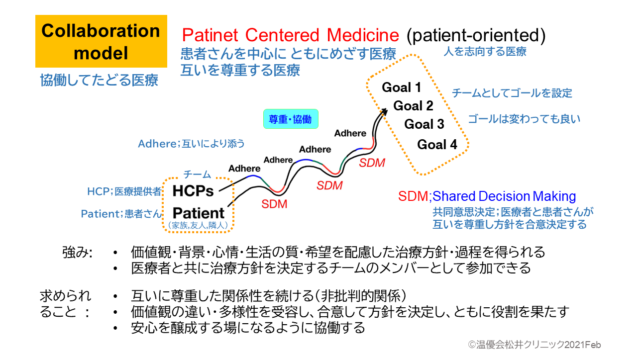 2つ目は、「Collaboration model(協働型医療)」です。このアプローチは、患者さんの生活背景や心情、希望に配慮した、「患者さん中心の医療」です。