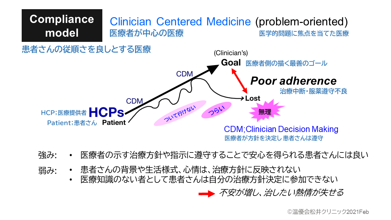 そこでは患者さんはその方針を守ろうと努力するのですが、生活や仕事と両立できず、自分の意思が通らず、決められたゴールが遠く届かないものに感じられて続けられず、それでも頑張るのですが、評価を得られず自信を失い、健康になりたいと目指したはずの医療がつらい体験になり、続けられなくなります。
